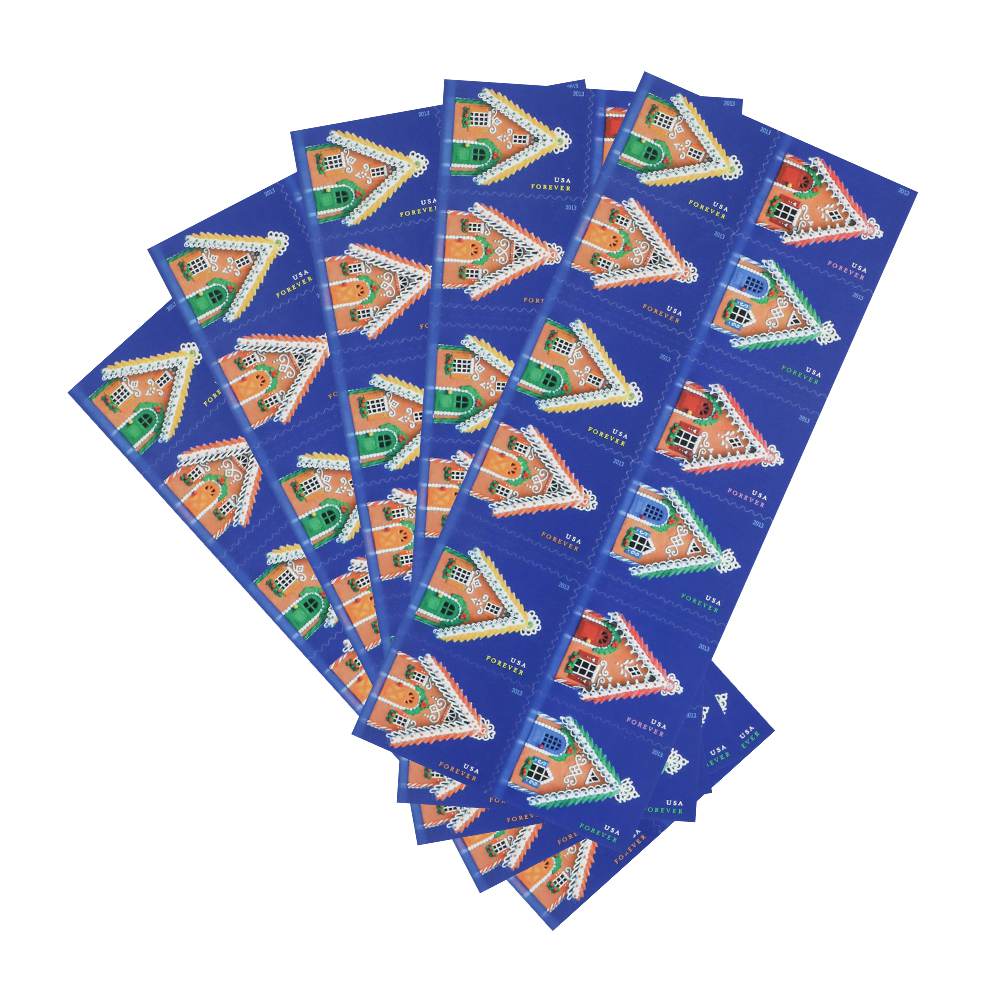 This stamp is part of a block of four issued for the 2013 holiday season. The gingerbread houses were constructed specifically for the stamp design.